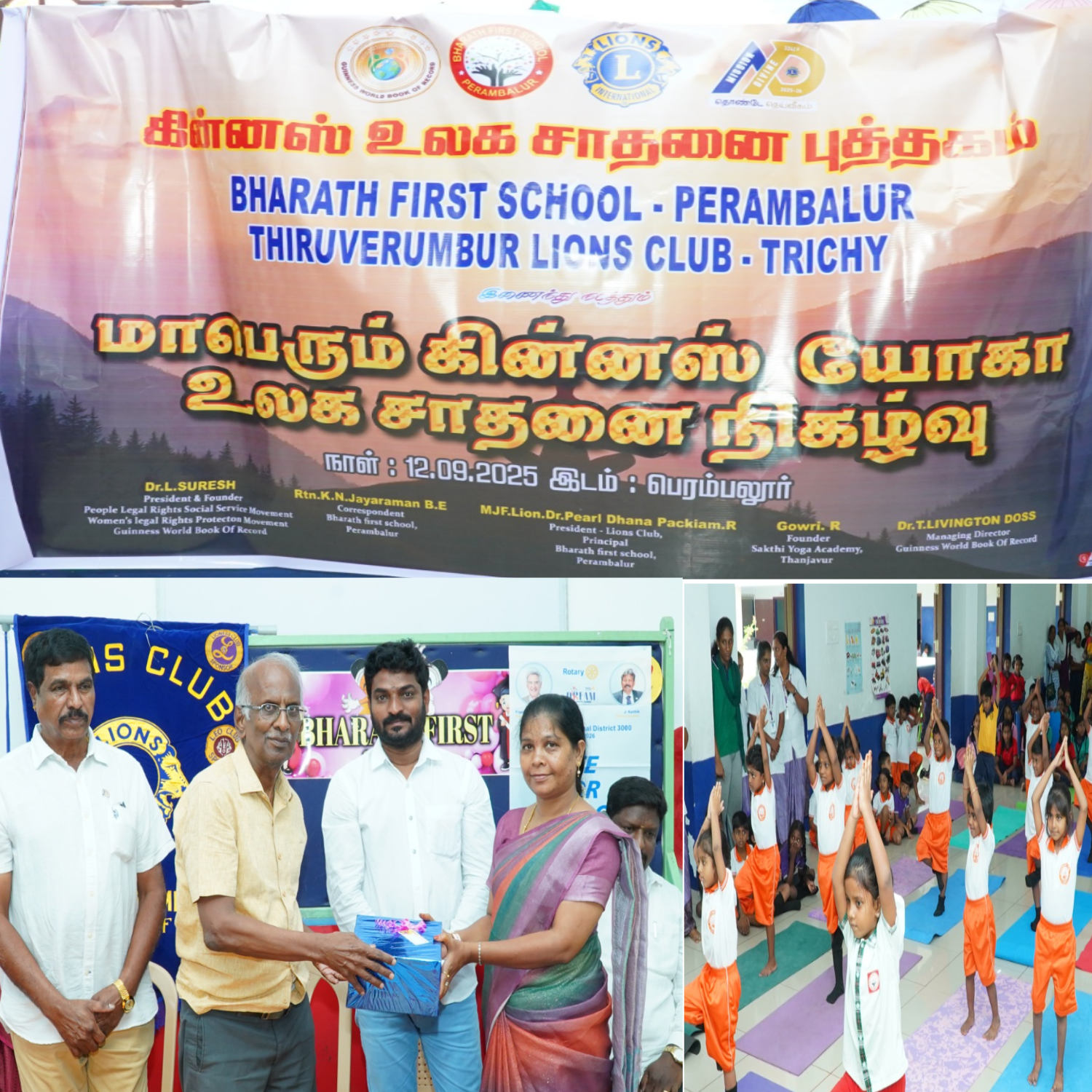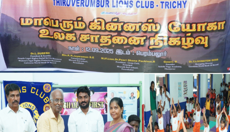 மாபெரும் கின்னஸ் யோகா உலக சாதனை நிகழ்ச்சி பெரம்பலூரில் உள்ள பாரத் பஸ்ட் ஸ்கூலில் 12 9 2025 வெள்ளிக்கிழமை காலை 10 மணி அளவில் சுமார் 200 பள்ளிக்குழந்தைகள் பங்கேற்று சுமார் 30 நிமிடம் இடைவிடாமல் யோகாசனம் செய்து உலக சாதனை படைத்தார்கள்.இந்த நிகழ்வில் கின்னஸ் வேர்ல்டு புக் ஆஃப் ரெகார்ட்,கவுண்டர் மற்றும் பாரத் ஸ்கூல் நிறுவனர். தலைமையாசிரியர். மற்றும் ஆசிரியர் பெருமக்கள் அனைவரும் கலந்து கொண்டனர்.