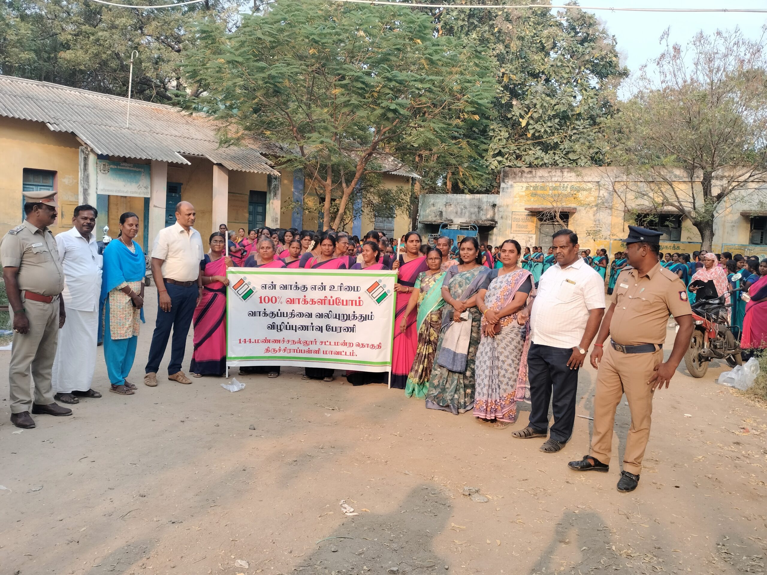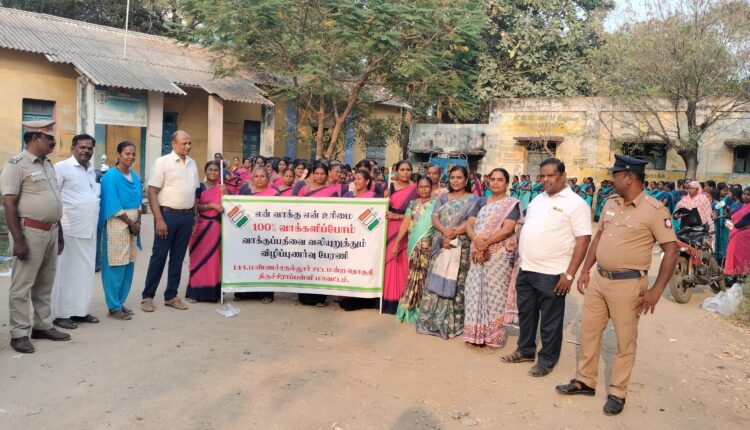 திருச்சி மாவட்டம் மண்ணச்சநல்லூரில் 26 2 2026 அன்று மாலை 4 மணியளவில் மாவட்ட குழந்தை வளர்ச்சித் திட்ட துறை சார்பில் மாவட்ட குழந்தை திட்ட அலுவலர் நித்தியா தலைமையில் 100% வாக்குப்பதிவை வலியுறுத்தி மகா பேரணி நடைபெற்றது. பேரணியில் மண்ணச்சநல்லூர் வட்டாட்சியர் ராஜேஷ் கண்ணன், புள்ளியில் ஆலோசகர் முருகேசன் காவல் உதவி ஆய்வாளர் முத்துராமகிருஷ்ணன் ஆகியோர் முன்னிலையில் சுமார் 250 அங்கன்வாடி பணியாளர்கள் பேரணியில் பங்கு பெற்றனர்.