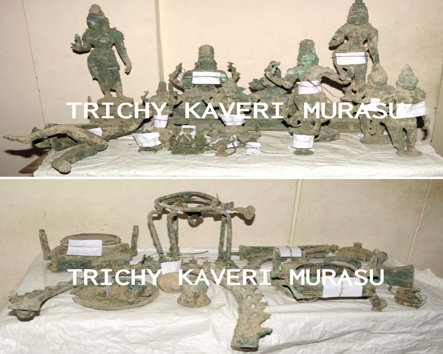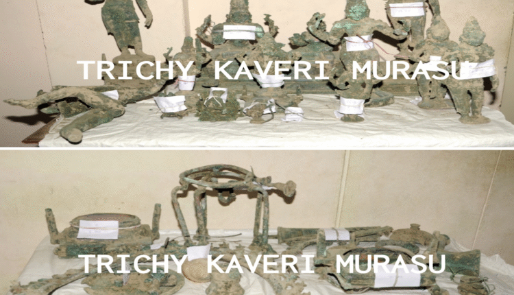 திருச்சி மாவட்டம் தொட்டியம் வட்டம் காட்டுப்புத்தூர் கிழக்கு வருவாய் கிராமமான நத்தமேடு பகுதியில் காட்டுப்புத்தூர் பேரூராட்சிக்கு ஒதுக்கீடு செய்யப்பட்ட புறம்போக்கு நிலத்தில் திடக்கழிவு மேலாண்மை திட்டத்தை செயல்படுத்தும் பொருட்டு 27 9 2025 அன்று சுமார் 11:30 மணி அளவில் அஸ்திவாரம் உள்ளிட்ட பணிகள் நடைபெறுவதற்காக குழி தோண்டும்போது உலோக செப்பு திருமேனிகள் கண்டெடுக்கப்பட்டதாக தொட்டியம் வட்டாட்சியருக்கு தகவல் கிடைக்கப்பெற்ற பேரில் ஆய்வு செய்ததில் சுமார் 14 உலோக செப்பு திருமேனிகளும் 7 பூஜைக்காக பயன்படுத்தப்படும் சங்கு பீடங்கள் போன்றவை கிடைக்கப்பெற்றுள்ளன. மேற்படி பொருட்கள் உடனடியாக தொட்டியம் வட்டாட்சியரால் கைப்பற்றப்பட்டு பாதுகாப்பினை கருத்தில் கொண்டு சார் நிலை கருவூலத்தில் ஒப்படைக்கப்பட்டுள்ளது. கண்டெடுக்கப்பட்ட உலோக செப்பு திருமேனிகள் மற்றும் பொருட்கள் “விஷ்ணு துர்க்கை” “தேவியுடன் பணிப்பெண்” “நடராஜர் சிலை உடைந்த நிலையில்” “தட்சிணாமூர்த்தி” “விநாயகர்” “விநாயகர் நின்ற நிலையில்” “தேவி சிவன்” “தேவி” “தேவி” “சந்திரசேகர்” “சீதாதேவி உடைந்த நிலையில்” “அமர்ந்த நிலையில் சிவன் பார்வதி” “கோதண்டராமன்” “உடைந்த பூஜை பொருட்கள்” “சங்கு” “பீடம் உடைந்த நிலையில்” “பீடம்” “தாங்கிகள்” “திருவாச்சி பெரியது” “திருவாச்சி உடைந்த நிலையில் சிறியது 4 துண்டுகள்”போன்ற 21 உலக செப்பு திருமேனிகள் கிடைக்கப்பெற்றுள்ளது. இது தொடர்பாக திருச்சிராப்பள்ளி தொல்லியல் அலுவலருக்கு தகவல் தெரிவிக்கப்பட்டு தொல்லியல் அலுவலர் ஆய்வு செய்யப்பட்டு அரசுக்கு முதல் நிலை அறிக்கை சமர்ப்பிக்க தெரிவிக்கப்பட்டுள்ளது. மேற்கண்ட தகவலை திருச்சிராப்பள்ளி மாவட்ட ஆட்சித் தலைவர் சரவணன் தெரிவித்துள்ளார்.