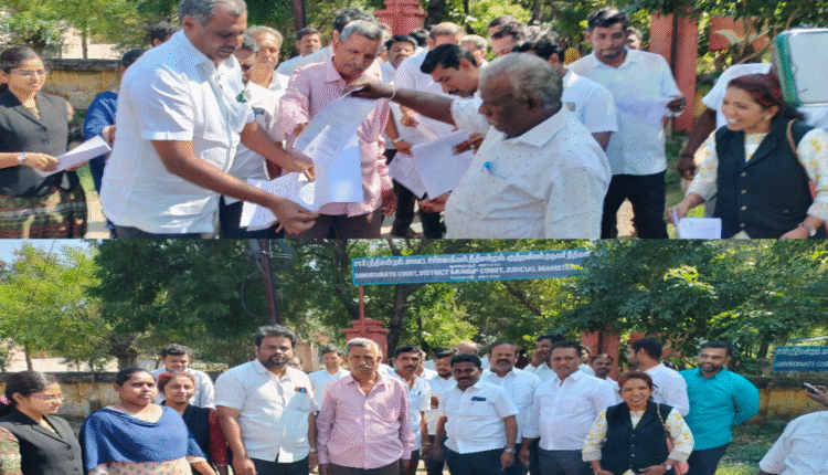 வழக்கறிஞர்கள் சங்கச்செயலாளர் வழக்கறிஞர் முகமதுரஃபிக், பொருளாளர் வழக்கறிஞர் நரேஷ்குமார் முன்னிலையில் நடைபெற்ற போராட்டத்தில் இ-ஃபைலிங் முறையை முழுமையாக ரத்து செய்ய வேண்டும் என்று கோஷங்கள் எழுப்பப்பட்டன.