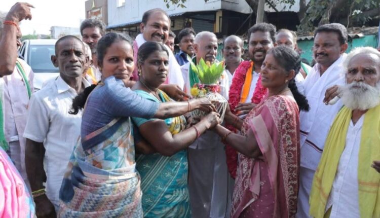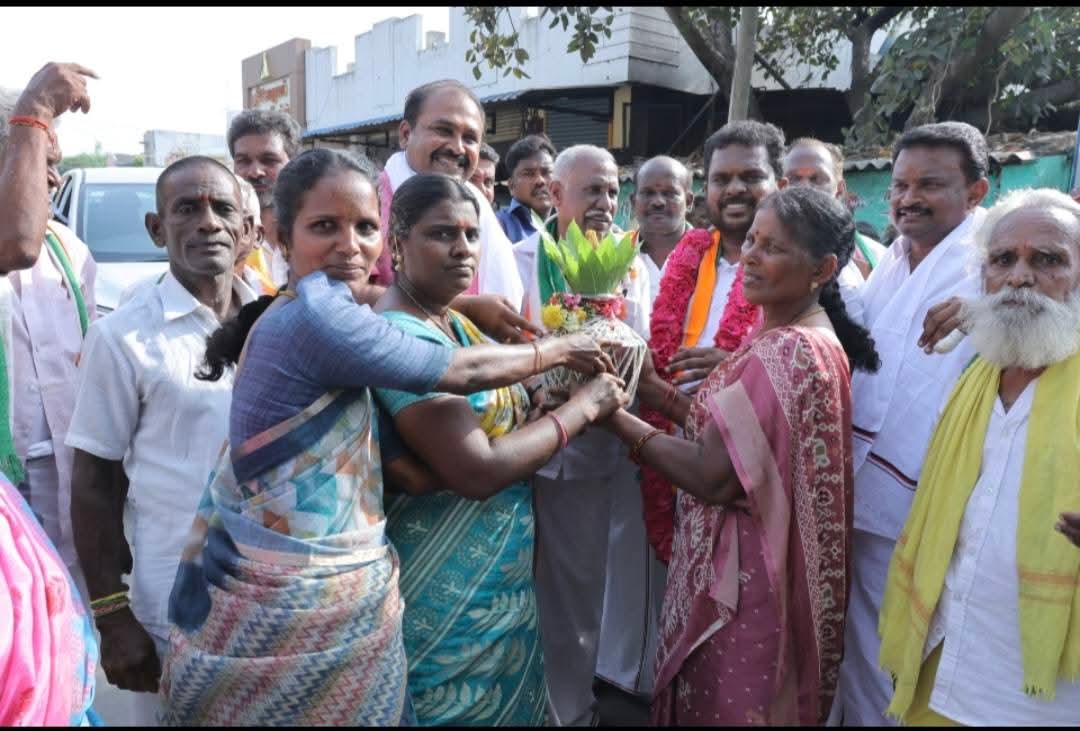 திமுக கூட்டணி கட்சி வேட்பாளருக்கு பெண்கள் பூரண கும்பம் மரியாதை